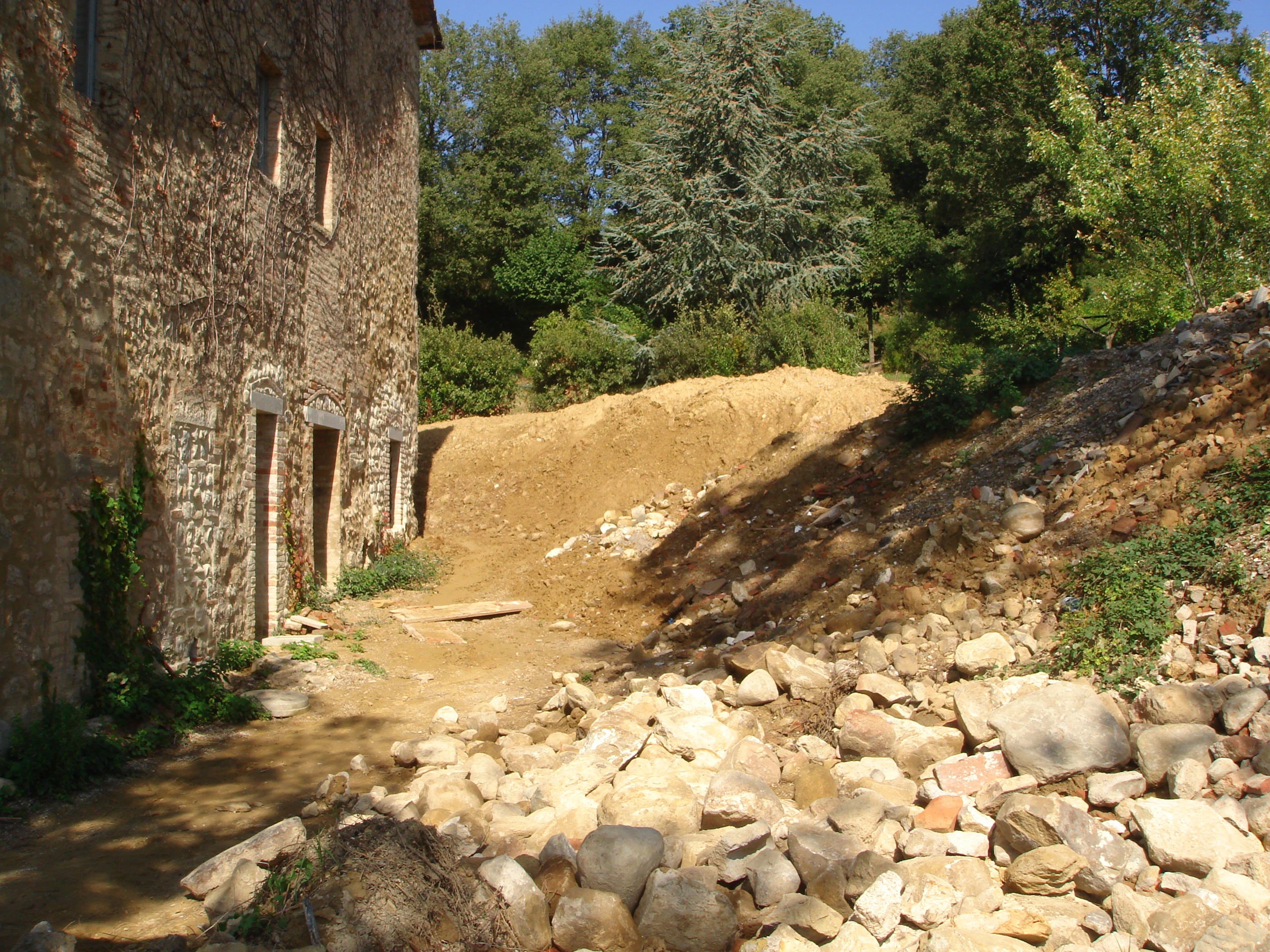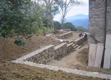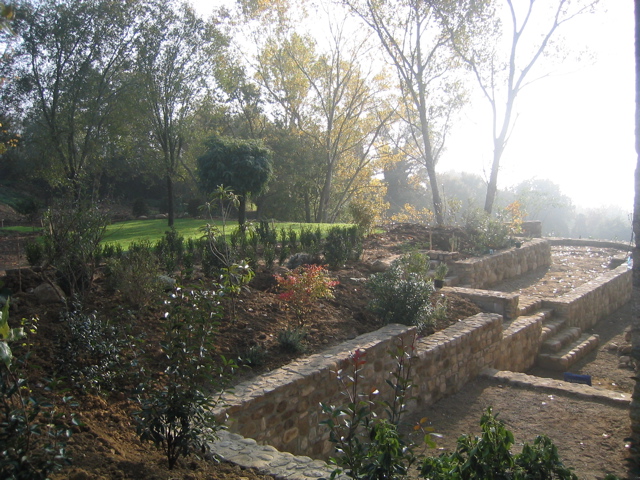 set into the earth terrace. This connects to the house via a stone bridge