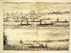 A famous two panel copperplate engraving a) showing Dutch galleons surrounded by