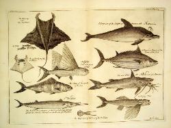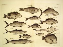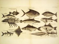 island, a view from 18 leagues out at sea and two diagrams of fishes caught in the area;