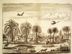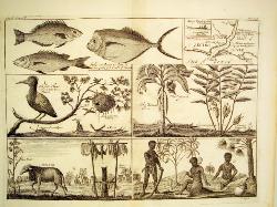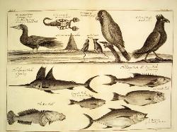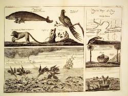 5 panel engraving of various creatures, a small map of Papo’s Bay at Tary (?), birds eating