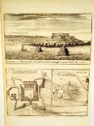 A three panel copperplate engraving showing; a) The Fort Fredricksburgh formerly to ye