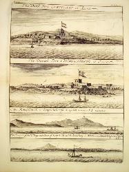 A three part copperplate engraving of views of the Ghanaian coast, two of which feature